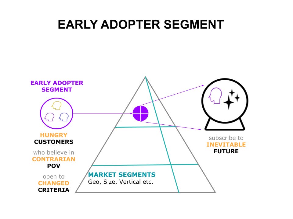 These are the ideal customer personas (ICPs) who are hungry to solve a burning problem that you have identified in your contrarian POV; and they are willing to accept the new changed criteria of usage and purchase. Ideally, many of these customers would also be open to your vision of an inevitable future that can unfold over time.