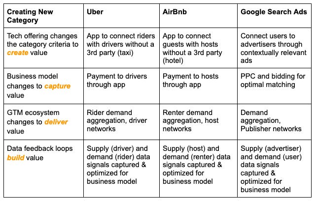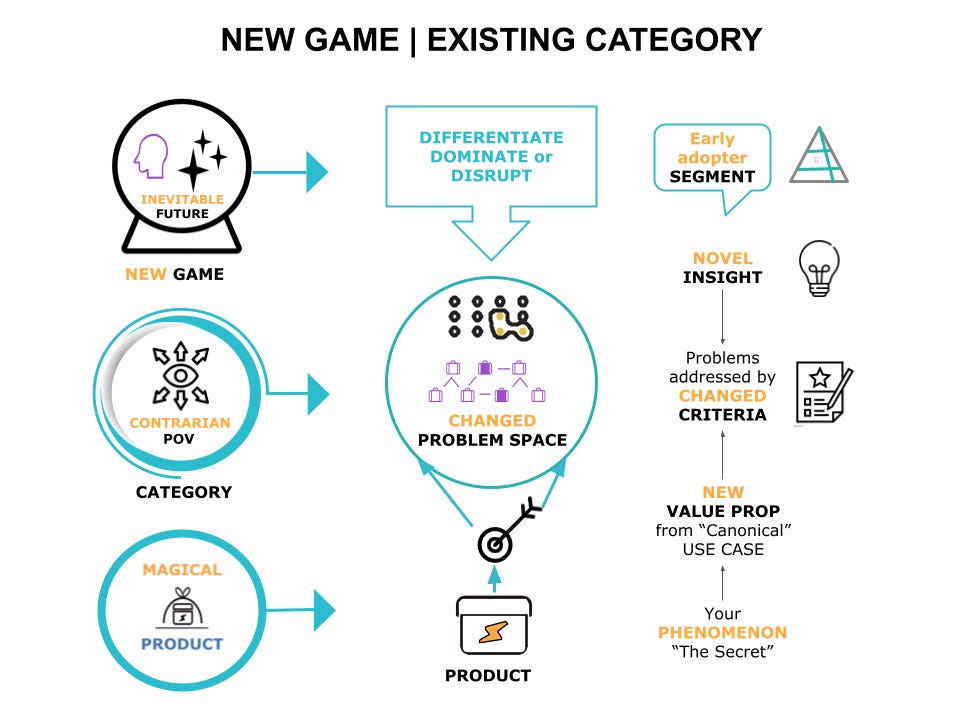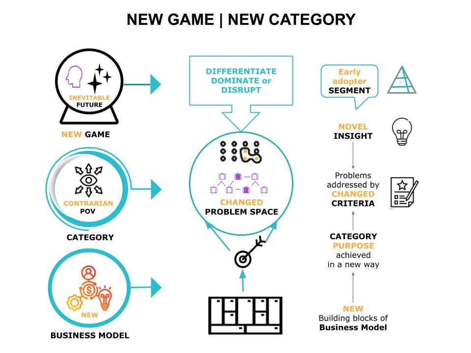 Most startups are not radical enough to create a new category. So I haven't covered new category creation at length. However, some tech companies may evolve over time to create a new category. The framework we have developed above can be extended playing a new game in a new category.