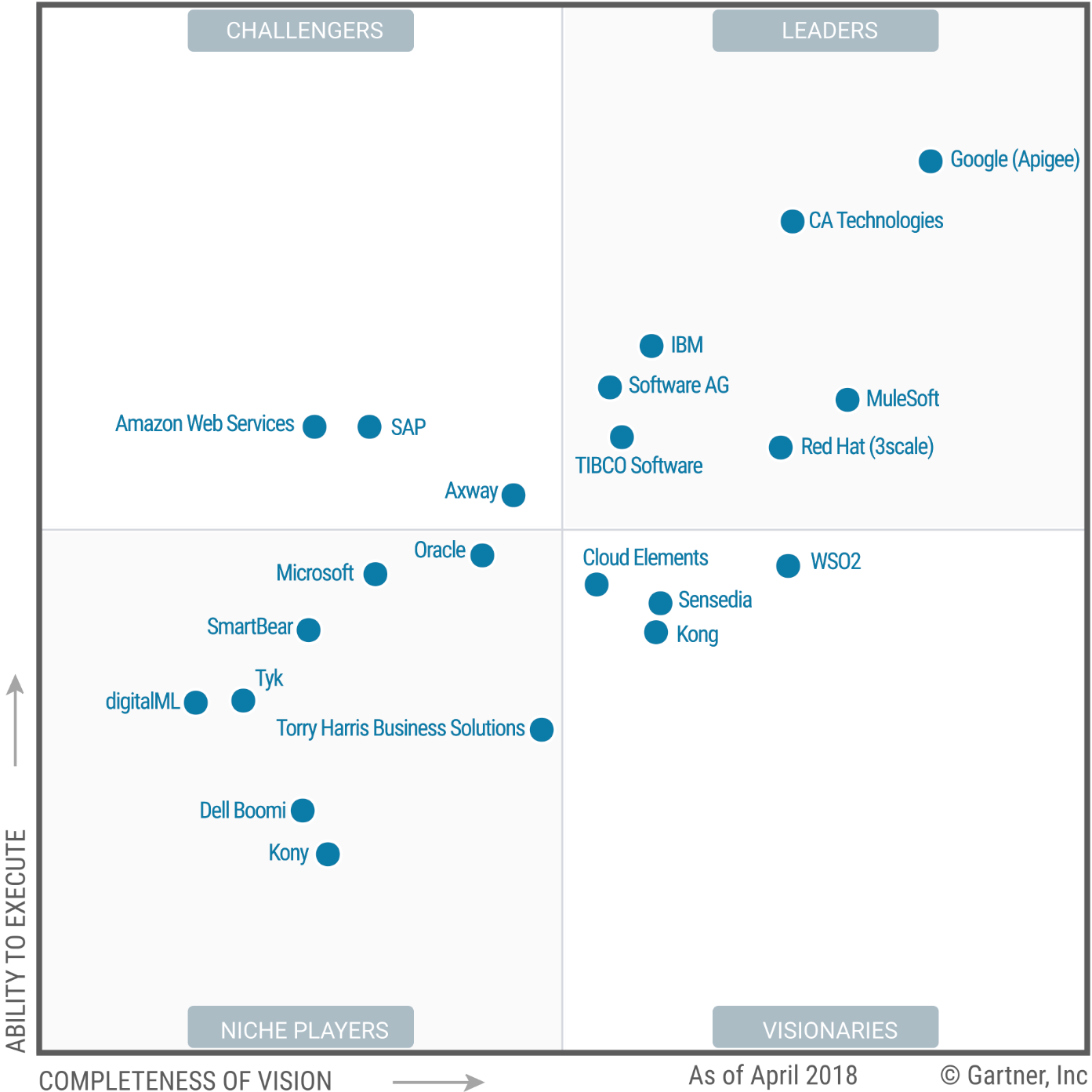 In 2016, Apigee was acquired by Google as we were rated as #1 visionary leader by Gartner in their Magic Quadrant despite being one of the smallest vendors. By 2018, Google became a leader in multi-cloud API management platform. This was a result of multi-year effort across the company to set, play and win the category game.